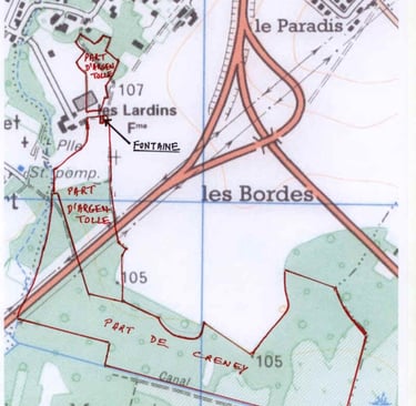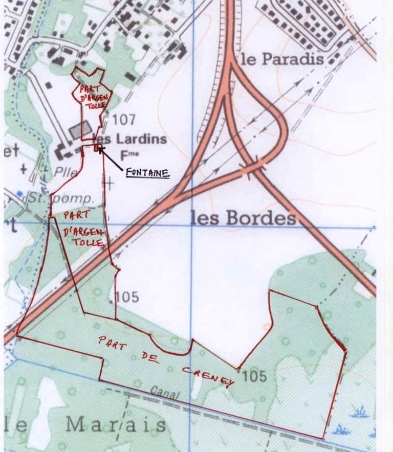 1° Lesdits habitans et communauté d'Argentolle auront et leur apartiendra en toute propriété pour en jouir dès maintenant à toujours [?] cédé et abandonné à titre de partage par lasdits habitans et communauté de Creney, la quantité de dix sept arpens faisant partie de soixante deux arpens soixante cinq cordes, que contient la portion dont jouissaient par indivis lesdites deux communautés dans ledit marais desséché et en patures depuis la transaction passée entre ces mêmes communautés et Madame De Morville le huit septembre mil sept cent cinquante sept duement homologué, lesdits dix sept arpens à prendre en deux pièces séparées par un passage de communication pour la ferme des Lardins, la première des deux pièces proche des maisons dudit Argentolle faisant plusieurs figures et haches contenant deux arpens cinquante cinq cordes, et la seconde de l'autre côté dudit passage contenant quatorze arpens quarante cinq cordes, tenant d'une part du nord aux terres labourables, d'autre du midy au rup des fontaines Et au surplus de la pièce d'un bout à la chaussée ou passage de ladite ferme, d'autre au surplus de la pièce, lesdits dix sept arpens [???] sont présentement lavés en vert pré sur ledit plan.